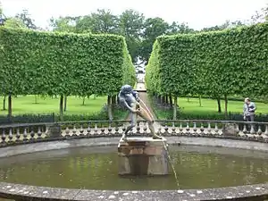 Before the north front of the house is a formal lawned parterre with a bronze fountain depicting Mercury. Leading from the immediate vicinity of the house are a series of woodland avenues which lead to smaller gardens; in the form of roundels these gardens include a citrus garden, a rose garden and a swinging garden.[23] Other woodland vistas lead to various eye catching garden statues, including a monumental urn containing the relics of the 2nd Lord Faringdon.
