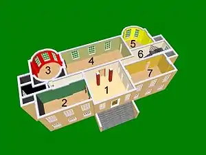 The interior of the mansion has been considerably altered and restored since its completion. The rooms are arranged in a circuit, although the principal room, the saloon, is flanked by slightly smaller rooms and adjoining cabinets. It is unlikely these smaller rooms were ever principal bedchambers, as would have been the case just a few years earlier in the 18th century.[14] In fact, the layout was probably completely modern at the time; this is suggested by the siting of the dining room (3 on plan) and the drawing room (6 on plan). Geddes Hyslop's remodelling of the house in 1934 has created a series of seemingly meaningless and similar reception rooms, designed to accommodate large house parties. In some cases (including the Dutch Room) smaller rooms were amalgamated and lost. This has hidden the original uses of the rooms. During the late 18th century, rooms came to be perceived as masculine and feminine and arranged in suites accordingly. In particular the dining and drawing rooms "reigned as king and queen over the other rooms" and were often, as at Buscot, placed symmetrically in the house with a hall or saloon dividing them.[15] The dividing room not only served to muffle the noise of boisterous men, partaking of their post-prandial port and cigars in the "masculine" dining rooms, from the more delicate ladies in the "female" drawing room, but also provided a "little state and distance" for the formal procession from the drawing room to the dining room.[16]