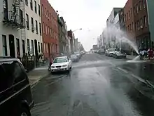 Newspapers around the country published UPI and the Associated Press's photos of Bushwick residents with stolen items and a police officer beating a suspected looter, and Bushwick became known for riots and looting.[51] Fires spread to many residential buildings as well. After the riots were over and the fires were put out, residents saw unsafe dwellings and empty lots among surviving buildings, leading one author to describe the scene as "some streets that looked like Brooklyn Heights, and others that looked like Dresden in 1945":[50]: 181 The business vacancy rate on Broadway reached 43% in the wake of the riots.[46]