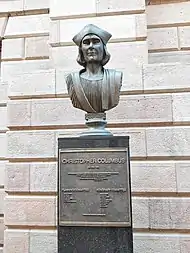 A bust of Christopher Columbus was installed in Lancaster, Pennsylvania, United States in 1992. The bust was dedicated at the Lancaster County Courthouse on the 500th anniversary of Christopher Columbus’ discovery of America. Designed by Art Research and Technology of Lancaster at a cost of $13,000,[2] the bronze bust depicts Columbus with chin-length hair, wearing a period hat and a pleated shirt and cloak. It was surveyed by the Smithsonian Institution's "Save Outdoor Sculpture!" program in 1995.[1]