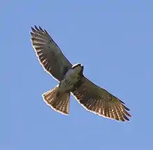 All Buteo species are to some extent opportunistic when it comes to hunting, and prey on almost any type of small animal as it becomes available to them. However, most have a strong preference for small mammals, mostly rodents. Rodents of almost every family in the world are somewhere preyed upon by Buteo species.[5][6][7] Since many rodents are primarily nocturnal, most buteos mainly hunt rodents that may be partially active during the day, which can include squirrels and chipmunks, voles, and gerbils. More nocturnal varieties are hunted opportunistically and may be caught in the first or last few hours of light.[5][7] Other smallish mammals, such as shrews, moles, pikas, bats, and weasels, tend to be minor secondary prey, although can locally be significant for individual species.[5][7] Larger mammals, such as rabbits, hares, and marmots, including even adult specimens weighing as much as 2 to 3 kg (4.4 to 6.6 lb), may be hunted by the heaviest and strongest species, such as ferruginous,[7][10][11] red-tailed[12] and white-tailed hawks.[13] Birds are taken occasionally, as well. Small to mid-sized birds, i.e. passerines, woodpeckers, waterfowl, pigeons, and gamebirds, are most often taken. However, since the adults of most smaller birds can successfully outmaneuver and evade buteos in flight, much avian prey is taken in the nestling or fledgling stages or adult birds if they are previously injured.[5][7] An exception is the short-tailed hawk, which is a relatively small and agile species and is locally a small bird-hunting specialist.[14] The Hawaiian hawk, which evolved on an isolated group of islands with no terrestrial mammals, was also initially a bird specialist, although today it preys mainly on introduced rodents. Other prey may include snakes, lizards, frogs, salamanders, fish, and even various invertebrates, especially beetles. In several Buteo species found in more tropical regions, such as the roadside hawk or grey-lined hawk, reptiles and amphibians may come to locally dominate the diet.[5] Swainson's hawk, despite its somewhat large size, is something of exceptional insect-feeding specialist and may rely almost fully on crickets and dragonflies when wintering in southern South America.[15][16] Carrion is eaten occasionally by most species, but is almost always secondary to live prey.[5] The importance of carrion in the Old World "buzzard" species is relatively higher since these often seem slower and less active predators than their equivalents in the Americas.[17][18][19] Most Buteo species seem to prefer to ambush prey by pouncing down to the ground directly from a perch. In a secondary approach, many spot prey from a great distance while soaring and circle down to the ground to snatch it.[5]