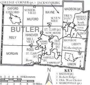 Butler County is a county located in the southwestern part of the U.S. state of Ohio. As of the 2020 census, the population was 390,357.[2] Its county seat and largest city is Hamilton.[3] It is named for General Richard Butler, who died in 1791 during St. Clair's Defeat.[4] Located along the Great Miami River, it is also home to Miami University, a public university founded in 1809. Butler County is part of the Cincinnati, OH-KY-IN Metropolitan Statistical Area. The majority of the county is in District 52 of the State House.