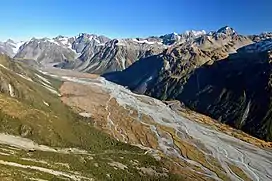 ![]() Butler Range (top centre) to the right of the Rakaia River | |