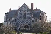 Standing centrally on the priory's northern precinct boundary,[74] the gatehouse was built in the early 14th century to provide a grand entrance and to accommodate important visitors.[75] Substantially original, it is called one of the finest examples of Decorated Gothic architecture in Suffolk,[76] and one of the most complete and interesting monastic entrances surviving.[77] Its exuberant flint flushwork is the first blossoming of that technique, later so widespread in East Anglian religious architecture, and its heraldic display was ambitious in content and architecturally innovative. The impressive rib-vaulted central entrance passage and side chambers dictated the need for large external buttresses. A portal between the temporal and cloistered worlds, the Gatehouse was in its time a prestigious addition to the priory, and remains a monument to the priory itself and to the taste and resources of its patron. It also attracted some distinguished visitors.