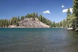 The irregularly-shaped lake lies at the northern end of Cinder Cone and the Fantastic Lava Beds, which is a complex of lava flows and a cinder cone. Lava from Cinder Cone's 1666 eruption flowed into and around the lake.[1] This formed an underwater lava field. Water from Snag Lake to the south flows through the porous lava field to Butte Lake.[2] Water from Butte Lake drains via Butte Creek, which flows north out of the parkland.