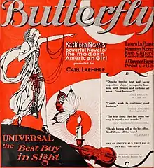 Butterfly is an extant 1924 American silent romantic drama film feature directed by Clarence Brown and starring Kenneth Harlan, Laura La Plante, and Norman Kerry. It was produced and distributed by Universal Pictures.[1][2][3]