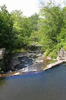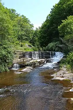In the distant past, accumulating piles of glacial drift caused Buttermilk Creek to alter its course and flow over a series of cliffs as a waterfall.[7] The total height of the cliffs is 155 feet (47 m) and they consist of sandstone of the Catskill Formation.[7][8] The falls, which are known as Buttermilk Falls, are a series of low waterfalls that are an "excellent example of the type" and "the most outstanding example of this kind of waterfall system in Pennsylvania".[8] Each individual waterfall ranges in height from 10 to 35 feet (3.0 to 10.7 m). The falls are located 0.3 miles (0.48 km) upstream of the creek's mouth.[8] Buttermilk Creek flows through a narrow defile in its lower reaches. In some reaches, the creek flows through bottom lands and swamps in glacial drift.[5]