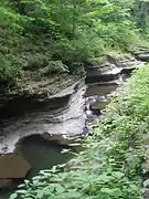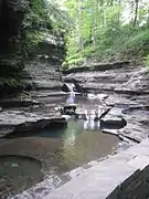 The rock formations within the park are primarily made of Devonian shale and sandstone.[7] These rocks formed in horizontal layers, creating flat slabs and angular edges as they erode and fracture. The gorge and waterfalls formed since the last ice age — within the last twenty or thirty thousands years — as Buttermilk Creek eroded back from the head of a hanging valley.[7] Additional formations along the creek include potholes and a stack called "Pinnacle Rock".