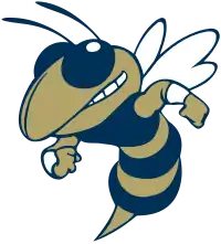 In 1979, McNair's idea for a Yellow Jacket was reintroduced by another Georgia Tech student, Richie Bland.[5] Bland, who was apparently unaware of McNair's prior initiative, paid $1,400 to have a local theme park costume designer make a yellow jacket costume that he first wore at a pep rally prior to the Tennessee football game.[5] Rather than obtain permission from Georgia Tech as Judi had done in 1972, this student, a few weeks later simply sneaked onto the field in costume during a football game and ran across the field.[5] The fans naturally believed that this costumed character was acting as an official member of the cheerleading squad and responded accordingly.[5] By 1980 this new incarnation of the yellow jacket mascot was given the name Buzz Bee and was adopted as an official mascot by Georgia Tech.[5] This new Buzz character would be the model for a new Georgia Tech emblem, designed in 1985 by Mike Lester.[11]