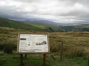 Bwlch y Groes (translates from Welsh as pass of the cross) is the second highest public road mountain pass in Wales,[1] with a summit altitude of 545 metres (1,788 ft). Gospel Pass in south Wales is slightly higher. It lies on minor roads linking Dinas Mawddwy (via Llanymawddwy), Llanuwchllyn and Lake Vyrnwy. The view from the pass encompasses the plain of the Dyfi valley, Cadair Idris and a close view of Aran Fawddwy.[2] The cross, just below the summit at the junction of the roads from Vyrnwy and from Dinas Mawddwy, commemorates the place of the pass on a pilgrim route from north Wales.[3]