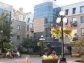 Over the years, the city has developed five open-air courtyards immediately east of Sussex Drive, stretching from Saint Patrick Street to George Street. These cobblestone courtyards are filled with flowers, park benches, fountains, and sculptures. Several of the houses surrounding them are historic buildings. On the west side of Sussex Drive is the United States Embassy. The building's design, by noted architect David Childs, was supposedly widely criticized by surrounding residents, as one particular Ottawa Sun newspaper article reported that the bronze building-block sculpture created by Joel Shapiro and dedicated by Hillary Clinton was "glaringly and gratingly American", whereas some critics declared that the building's new design "reflected a cautious world view".[5]