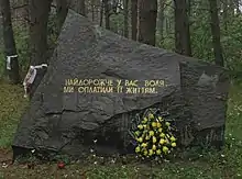The Bykivnia graves (Ukrainian: Биківнянські могили) are a National Historic Memorial next to the former village of Bykivnia (Ukrainian: Биківня, Polish: Bykownia) within Kyiv woodland, Bykivnia Forest. During the Stalinist period in the Soviet Union, it was one of the unmarked mass grave sites where the NKVD, the Soviet secret police, disposed of thousands of executed "enemies of the Soviet state".