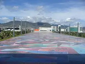 Gálvez also created murals and sculptures, both small and monumental. His first mural was sculpted done in 1968 in Los Angeles.[2] However, most of his monumental work was produced later in his career as he concentrated on painting in the 1970s and 1980s.[4][13] These include a mural at the National Conservatory of Music in Mexico City (1970), a thirty-foot high sculpture in Unidad Morelos in Mexico City (1971), a hand hammered copper triptych for a private residence in Mexico City (1984), a sculpted door for a private residence (1985), a sculpture for a private home in New York (1986), Reclined Torso at the Hotel Nikko Mexico (1998), Torso I a five-foot high sculpture for the city of Pachuca (1999), Torso II a nineteen foot high sculpture at the Altiva Building, Mexico City (1999), Millennium, a bronze sculpture/fountain at the highway entrance to Pachuca (2000), a sculpture garden for Mixquiahuala, Hidalgo (2005) and the master plan and central mosaic for the David Ben Gurion Cultural Park in Pachuca (2005) .[3][4][9] The park project, the last before his death, included not only the creation of the central mosaic, the largest pedestrian mural in the world at 345,000ft2, but also the design of the 65-acre park itself.[13]