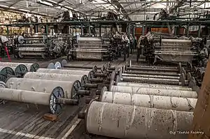 | Byssinosis is caused by exposure to cotton dust in inadequately ventilated working environments. Image of a textile mill where fibrous material, such as cotton, is processed from machinery. | |