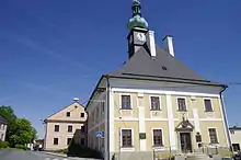 The Baroque town hall built in 1716–1719 is unique with its high gabled roof and clock tower in all four directions.[2][7]
