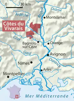 Côtes du Vivarais is a wine-growing AOC in the northwestern extreme of the southern Rhône wine region of France. The wines are produced in 9 communes of the Ardèche department, and in 5 communes of the department of the Gard. The region is bisected by the deep Gorges of the Ardèche and is shares the same latitudes as the Coteaux de Tricastin AOC on the left bank of the Rhône. The wine became a VDQS in 1962 and was awarded the Appellation d'Origine Contrôlée in 1999.