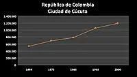 listen)), officially San José de Cúcuta, is a Colombian municipality, capital of the department of Norte de Santander and nucleus of the Metropolitan Area of Cúcuta. The city is located in the homonymous valley, at the foot of the Eastern Ranges of the Colombian Andes, on the border with Venezuela. It comprises an area of approximately 1119 km2, with an urban area of 64 km2 (divided into 10 communes) and a rural area of 1055 km2 (divided into 10 townships).[4] The city has a population of 777,106 inhabitants, which makes it the most populous municipality in the department and the sixth most populous municipality in the country.[5] Similarly, its metropolitan area (made up of the municipalities of Villa del Rosario, Los Patios, El Zulia, San Cayetano and Puerto Santander) has an approximate population of 1,046,347.[6]