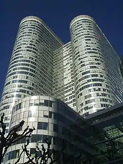 Coeur Défense was built in 2001,[1] replacing the former Esso Tower, the first building of the old generation to be destroyed in La Défense. Cœur Défense is a large complex made of two main bodies connected to one another by a smaller body and seating on a wide basis made of several smaller bodies. The edges of all bodies are rounded. The cladding is white, with large windows. An electronic system monitors white blinds which can be drawn or opened all together at the same time.