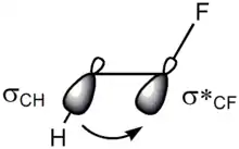 There are two main explanations for the gauche effect: hyperconjugation and bent bonds. In the hyperconjugation model, the donation of electron density from the carbon–hydrogen σ bonding orbital to the carbon–fluorine σ* antibonding orbital is considered the source of stabilization in the gauche isomer. Due to the greater electronegativity of fluorine, the carbon–hydrogen σ orbital is a better electron donor than the carbon–fluorine σ orbital, while the carbon–fluorine σ* orbital is a better electron acceptor than the carbon–hydrogen σ* orbital. Only the gauche conformation allows good overlap between the better donor and the better acceptor.[11]