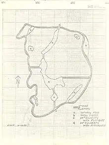 Construction plans called for completion of a perimeter dike around the subject section of islands, with the dike carried inside of a shell midden to avoid flooding tropical vegetation found there.[6] A pump house allowed flooding of the impoundment during the summer rainy season when mosquito breeding is most intense. Flapper valve gates at the north and south ends of the impoundment were installed to allow closure during flooding and opening during the dry season to allow water exchange with the lagoon.