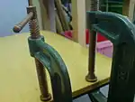 A C-clamp or G-clamp or G-cramp is a type of clamp device typically used to hold a wood or metal workpiece, and often used in, but are not limited to, carpentry and welding. Often believed that these clamps are called "C" clamps because of their C-shaped frame, or also often called C-clamps or G-clamps[1] because including the screw part, they are shaped like an uppercase letter G. However, in fact, they were originally called a carriage maker's clamp, or Carriage Clamp.