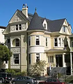 The house is on Gough Street, facing Lafayette Park. Designed by Walter J. Mathews, a prominent Bay Area architect, it is unusual in San Francisco in being purely Queen Anne in style.[4] It is three stories tall, with a steeply pitched gable roof and two corner turrets with conical roofs; the turrets and the first floor have fish-scale shingles, while the remainder of the house is clad in horizontal siding.[4] The main facade, facing the park, is decorated with carved and plaster areas that have been compared to "patterns appliqued on a Victorian sampler":[5] the pediment under the gable is richly carved, two sunbursts flank a pair of windows on the third floor, and below an arched window porch on the second floor is a panel with a grinning mythological beast.[4] The house's style has been characterized as "[a] full flowering of Queen Anne exuberance".[6]