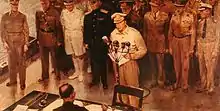 Beall's 1936 painting of President Roosevelt for Collier's cover page led to the position as art director for the Democratic National Committee.[8] Beall was temporarily an employee of the U. S. War Department.[9] At the same time, he was also a correspondent-artist for several magazines, including Collier's, and painted portraits of decorated war heroes. Beall was an eyewitness to the 1945 official Japanese surrender on the USS Missouri.[3] He painted General MacArthur at the event; his work later became the official portrait.[10][11]