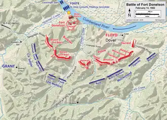 Colonel Marsh and the 20th were stationed at Bird's Point, Missouri until joining Ulysses S. Grant's expedition to Fort Henry as a part of W. H. L. Wallace's 2nd Brigade in John A. McClernand's 1st Division. At the battle of Fort Donelson Marsh was positioned on the right of the Union lines. McClernand's entire division was hit hard during the Confederate breakout attempt on February 15. Despite being hard pressed Marsh managed a counterattack which momentarily checked Simon B. Buckner's division and saved an Illinois artillery battery from capture.[5]
