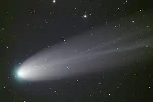 C/2021 A1 (Leonard) was a long period comet[4] that was discovered by G. J. Leonard at the Mount Lemmon Observatory on 3 January 2021 (a year before perihelion) when the comet was 5 AU (750 million km) from the Sun.[1] It had a retrograde orbit. The nucleus was about 1 km (0.6 mi) across. It came within 4 million km (2.5 million mi) of Venus, the closest-known cometary approach to Venus.[5]