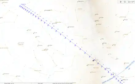 The comet's closest approach to Earth was on 1 February 2023, at a distance of 0.28 AU (42 million km; 26 million mi). As of 31 January 2023, the comet had an apparent magnitude of about 5; its coma was reported to be about 20' across.[11] During its closest approach to Earth, it was near the north celestial pole[30] and located within the Camelopardalis constellation.[31] The moon was a waxing gibbous and the brightening moon hampered viewing the comet without optical aid.[32] On 5 February, at the full moon, the comet passed 1.5 degrees from the bright star Capella.[32] On 6 February, C/2022 E3 (ZTF) visually passed near comet C/2022 U2 (ATLAS).[33] On 10 to 11 February, the comet passed 1.5 degrees from Mars and, on 13 to 15 February, passed in front of the Hyades star cluster.[19]