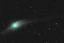 C/2022 E3 (ZTF) is a long-period comet from the Oort cloud that was discovered by the Zwicky Transient Facility (ZTF) on 2 March 2022.[1] The comet has a bright green glow around its nucleus, due to the effect of sunlight on diatomic carbon and cyanogen.[6][5] The comet's systematic designation starts with C to indicate that it is not a periodic comet, and "2022 E3" means that it was the third comet to be discovered in the first half of March 2022.[5]