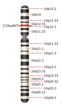 The gene spans 142,366 base pairs and is located at the 10p12.2 locus on the minus (-) or sense strand of chromosome 10. It is flanked upstream by the gene ARMC3[6] and downstream by the gene KIAA1217.[7][8] These genes are approximately 150,000 bp and 350,000 bp from C10orf67, respectively.