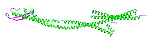 Shown to the right is a predicted tertiary structure of the protein. It is marked by long alpha-helices with several coil regions and beta strands localized to the end of the protein opposite the N- and C- terminal ends.