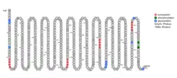 No transmembrane helices,[12] potential GPI-modification sites, or TM-proteins were found. There were seven predicted sumoylation sites,[13] multiple phosporylation cites with most of them being unsp,[14] and nine glycosylation sites.[15]