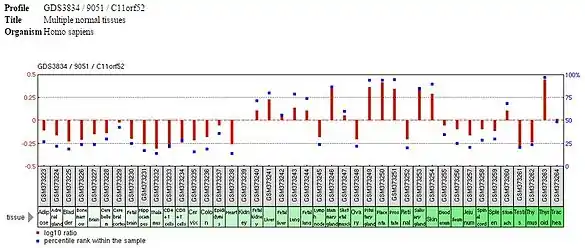 C11orf52 is highly expressed in the thyroid, thalmus, pituitary, placenta, and prostate, kidney, heart, and skeletal muscles.[7] However, in estrogen receptor alpha-silenced MCF-7 breast cancer cells, it is expressed at an extremely low level compared to control tissues.[8]