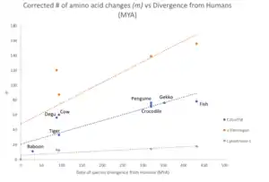 The rate of C21orf58 evolution was determined through an application of the Molecular Clock Hypothesis. Through comparison with alpha fibrinogen and cytochrome C, it was determined that C21orf58 has evolved at an intermediate rate.