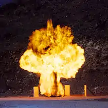 C-4 is very stable and insensitive to most physical shocks. C-4 cannot be detonated by a gunshot or by dropping it onto a hard surface. It does not explode when set on fire or exposed to microwaves.[12] Detonation can be initiated only by a shockwave, such as when a detonator inserted into it is fired.[7] When detonated, C-4 rapidly decomposes to release nitrogen, water and carbon oxides as well as other gases.[7] The detonation proceeds at an explosive velocity of 8,092 m/s (26,550 ft/s).[13]