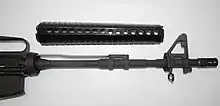 Example of a M16A1-type carbine modified with a rail interface system handguard to support Picatinny rail-compatible sights and accessories.