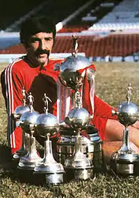![]() Ricardo Bochini with all the trophies he won with Independiente | |