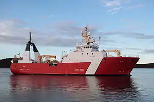 The vessel carries out surveys of the Newfoundland and Labrador region. Teleost is equipped with several types of laboratories. The vessel can also perform search and rescue duties.[4][5] In September 2009 the Department of Fisheries and Oceans announced invitations for contracts to replace several of the Coast Guard's research vessels, including Teleost.[6] Teleost underwent a $1.6 million refit at St. John's Dockyard in St. John's. The refit was extended past its deadline to 30 March 2018 after additional steel work was required on the ship. Teleost was scheduled to replace CCGS Alfred Needler on the Department of Fisheries and Oceans's fisheries survey on the Georges Bank since the latter was also undergoing a refit, but due to the refit's extension, became unavailable.[7]