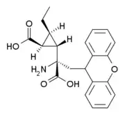 CECXG (3'-ethyl-LY-341,495) is a research drug which acts as a potent and selective antagonist for the group II metabotropic glutamate receptors (mGluR2/3), with reasonable selectivity for mGluR3. While it is some five times less potent than LY-341,495 at mGluR3, it has 38x higher affinity for mGluR3 over mGluR2,[1] making it one of the few ligands available that is able to distinguish between these two closely related receptor subtypes.[2][3][4]