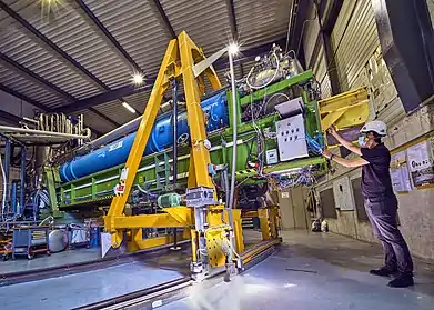 The RADES started searching for axion-like dark matter in 2018, and the first results from this detector were published in early 2021. Although no significant axion signal was detected above the noise background during the 2018-2021 period, RADES became the first detector to search for axions above . CAST helioscope (looks at sun) was made a haloscope (looks at galactic halo) in late 2017.[7] RADES detector attached to this haloscope has of a 1m long alternating irises- stainless-steel cavity able to search for dark matter axions around . Further prospects of improving the detector system with enhancements such as superconductive cavities and ferro-magnetic tunings are being looked into.[16][7]