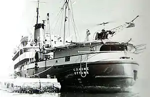During summer months, C.D. Howe made an annual voyage to the Eastern Arctic. During winter months, C.D. Howe performed icebreaking operations in the Gulf of St. Lawrence. The vessel was also used to train Canadian Coast Guard College cadets.[9] The ship's annual voyage to the Eastern Arctic consisted of resupplying northern settlements, activating navigation aids in the north and providing medical and dental services to remote communities. C.D. Howe carried personnel from the Departments of Natural Resources and Northern Affairs along with members of the Royal Canadian Mounted Police while performing its duties. The annual trip would take the vessel to northern Labrador, along the south and east coasts of Baffin Island and stopping at Ellesmere Island.[3] C.D. Howe operated as a hospital ship, carrying two doctors, two dentists and two nurses while travelling through the Arctic.[5] The ship stopped at remote Aboriginal communities and provided medical services to the inhabitants, while also screening them for signs of tuberculosis. This was at times, performed against the will of the inhabitants, with the vessel forcibly removing those Aboriginals who were considered by the medical professionals aboard to need further care. The forcible removal of some of those patients, sometimes without warning to family members, caused distress among the remote populations, causing some to flee the sight of the ship upon its arrival in Aboriginal communities.[10][11] As part of Canada's attempt to assert sovereignty over its Arctic territory, C.D. Howe, along with the icebreaker CGS D'Iberville, relocated Inuit that had been removed from their settlement at Port Harrison to new communities at Resolute and Grise Fiord in August and September 1953.[5][12] In 1962, C.D. Howe, along with the rest of the Department of Transport's maritime fleet, was transferred to the newly created Canadian Coast Guard and the vessel was given the new prefix CCGS.[13]