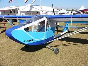 - Two seats in tandem, with the rear seat raised for visibility. Based on the Classic, but with a less sloped windshield, longer nose, larger tail surfaces, flatter floor and reinforced tail boom. Available as a fully assembled US Special Light Sport Aircraft. It incorporates the semi-symmetrical airfoil and streamlined extruded aluminum wing struts from the Hawk Sport. 186 flying in 2011. Standard empty weight 420 lb (191 kg) with a 950 lb (431 kg) gross weight. Engines available include the two-stroke, 52 hp (39 kW) Rotax 503, 65 hp (48 kW) Rotax 582, 55 hp (41 kW) Hirth 3202, 65 hp (48 kW) Hirth 3203, 80 hp (60 kW) Hirth F30, 100 hp (75 kW) Hirth 3701 and the four-stroke 60 hp (45 kW) HKS 700E.[1][2][3][4][6][14][15][16]