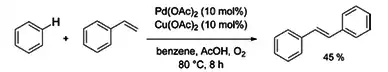 In some cases, discoveries in C-H activation were being made in conjunction with those of cross coupling. In 1969,[5] Yuzo Fujiwara reported the synthesis of (E)-1,2-diphenylethene from benzene and styrene with Pd(OAc)2 and Cu(OAc)2, a procedure very similar to that of cross coupling. On the category of oxidative addition, M. L. H. Green in 1970 reported on the photochemical insertion of tungsten (as a Cp2WH2 complex) in a benzene C–H bond[6] and George M. Whitesides in 1979 was the first to carry out an intramolecular aliphatic C–H activation[7]