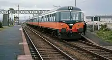 In 1969, the only mainline services remaining railcar-operated were one round trip per day on each of the Sligo–Dublin and Dublin–Rosslare routes.[28] The last mainline working was on the Dublin–Rosslare route in April 1970.[29] By 1971, conversions of the cars to push–pull stock had begun.[23] Early in 1972, it was reported that only a small railcar fleet would be retained in operational condition, pending the introduction of the push–pull trains.[30] In late 1974, eight cars were reportedly being kept operational to address a shortage of locomotives "by reason of damage by accidents and bomb incidents."[31] The last five railcars were withdrawn on 20 September 1975.[32] Ten of the 2600 Class, along with 19 of the AEC and BUT cars inherited from the Great Northern, were broken up rather than converted to push–pull stock.[33]