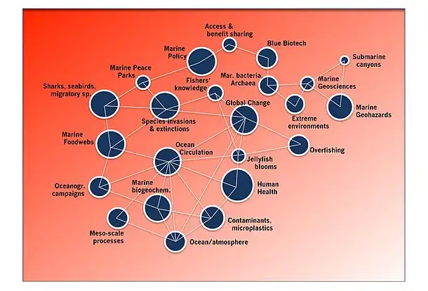 In 1993 CIESM responded to a request from the European Parliament and issued a detailed assessment of Marine Pollution in the Mediterranean.[13] In 1998 CIESM began running research workshops which continue to produce widely read monographs on emerging issues. Subjects have covered a diversity of sectors ranging from marine volcanoes and canyons, marine connectivity, the Messinian Salinity Crisis, Marine Peace Parks, impacts of climatic change on the ocean, species extinctions, marine biotechnologies, deep waters, acidification, emergent pollutants, food webs from marine viruses to whales, invasive species, social studies of fisheries, etc.[14] At that time the Commission started to deliver morphometric maps of the Mediterranean seabed, based on modern imagery provided by multibeam swath. Between 2013 and 2020 the CIESM JellyWatch program engaged an extensive survey of jellyfish outbreaks, monitored on a weekly basis in coastal waters from Morocco to the Black Sea.[15]