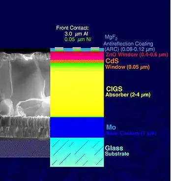 In photovoltaics "thinness" generally is in reference to so-called "first generation" high-efficiency silicon cells, which are manufactured from bulk wafers hundreds of micrometers thick.[29] Thin films sacrifice some light gathering efficiency but use less material.[30] In CIGS the efficiency tradeoff is less severe than in silicon. The record efficiencies for thin film CIGS cells are slightly lower than that of CIGS for lab-scale top performance cells. In 2008, CIGS efficiency was by far the highest compared with those achieved by other thin film technologies such as cadmium telluride photovoltaics (CdTe) or amorphous silicon (a-Si).[20] CIS and CGS solar cells offer total area efficiencies of 15.0% and 9.5%,[31] respectively. In 2015, the gap with the other thin film technologies has been closed, with record cell efficiencies in laboratories of 21.5% for CdTe (FirstSolar) and 21.7% for CIGS (ZSW). (See also NREL best research cell efficiency chart.[32])