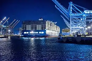 The December 26, 2015 arrival at the Port of Los Angeles[3] marked the first time a ship of this size had been used in North America - previous routes for a ship this large were only from Asia to Northern Europe. Benjamin Franklin is about a third larger than the biggest container ships that typically visit the deep water ports of southern California.[4] After departing Long Beach, she traveled north along the West Coast of the United States, arriving at the Port of Oakland near San Francisco on December 31,[5] and at the Port of Seattle on February 29, 2016.[6] The U.S. tour was short-lived, however, as CMA CGM postponed deployment of megaships to the West Coast in May 2016, citing a lack of demand.[7]