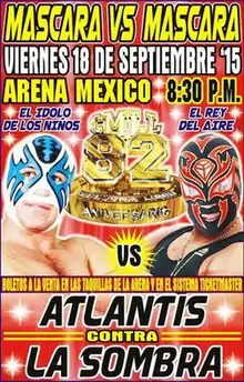 At the CMLL 80th Anniversary Show in 2013 the team of La Sombra and Volador Jr. faced off against Atlantis and Último Guerrero, in a Relevos Suicidas ("Suicide Relay") match where the winning team would face off against each other in a Lucha de Apuestas, or "bet match", in the main event of the show.[11] The match paired long time rivals Sombra and Volador against another pair of rivals in Atlantis and Guerrero with both rivalries stretching back several years at that point. In the end La Sombra and Volador Jr. won the match and the right to wrestle for their masks later on in the show. In the end La Sombra defeated Volador Jr., forcing him to unmask and reveal his real name per lucha libre traditions. During the show the fans voiced their displeasure of being denied the Atlantis/Último Guerrero match, the biggest storyline of that year and booed the técnico La Sombra as a way to show their displeasure of the "bait and switch" tactics.[11][12] After the 80th Anniversary the fan support led to Volador Jr. becoming a técnico and La Sombra stated to work a more aggressive, rudo-style of wrestling.[13][14] In 2014 he joined together with Rush and La Máscara to form Los Ingobernables ("The Unruly"), a trio that straddled the definition of rudo and tecnico, only getting along with members of Los Ingobernables even if paired up with tecnico wrestlers, while generally working against rudo wrestlers.[15] CMLL did finally deliver the Atlantis vs. Último Guerrero Lucha de Apuestas a year later at the CMLL 81st Anniversary Show where Atlantis defeated and unmasked Último Guerrero in the main event.[16] Over the summer of 2015 Los Ingobernables started to wrestle against tecnico teams instead of generally facing rudo teams as they had been up to that point. In August, 2015 Los Ingobernables found themselves facing off against Atlantis on multiple occasions, often with La Sombra going out of his way to attack Atlantis, tearing Atlantis' mask apart during matches to show his disdain for the veteran tecnico. On August 19, 2015 CMLL held a press conference where they announced that the winner of the main event of the 80th Anniversary, La Sombra, would put his mask on the line against the winner of the main event of the 81st Anniversary Show, Atlantis, in the main event of CMLL's 82nd Anniversary Show on September 18, 2015.[17] After the press conference both wrestlers stressed the fact that they were looking forward to a singles match between the two and hoping that no one would be added to the match in the way CMLL handled the 80th Anniversary Show.